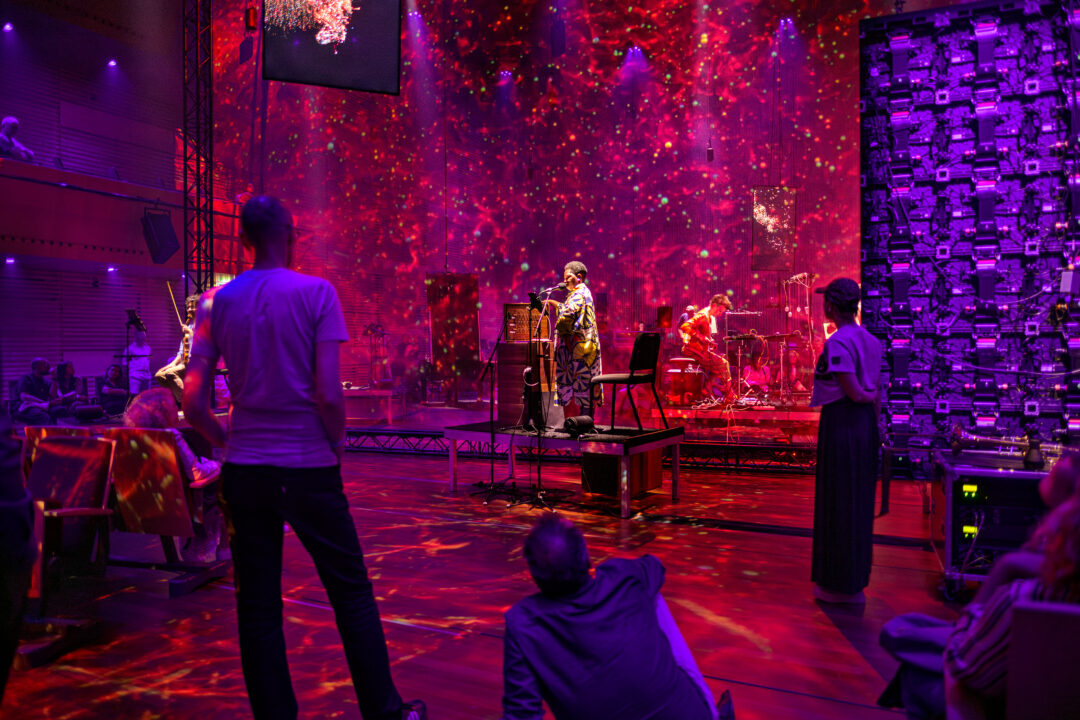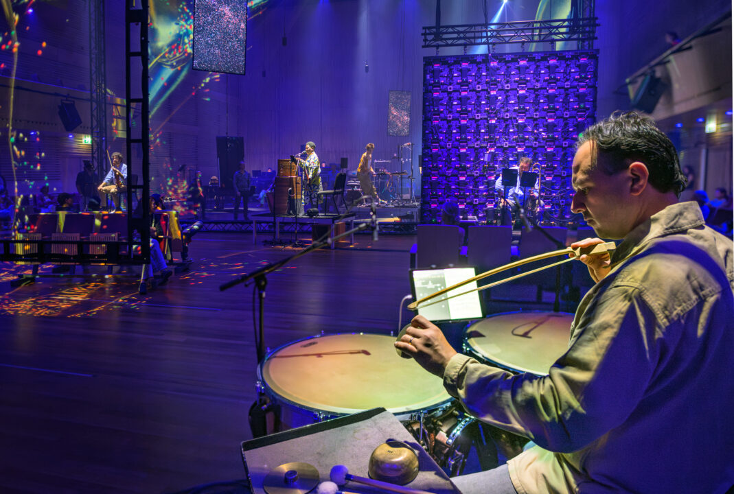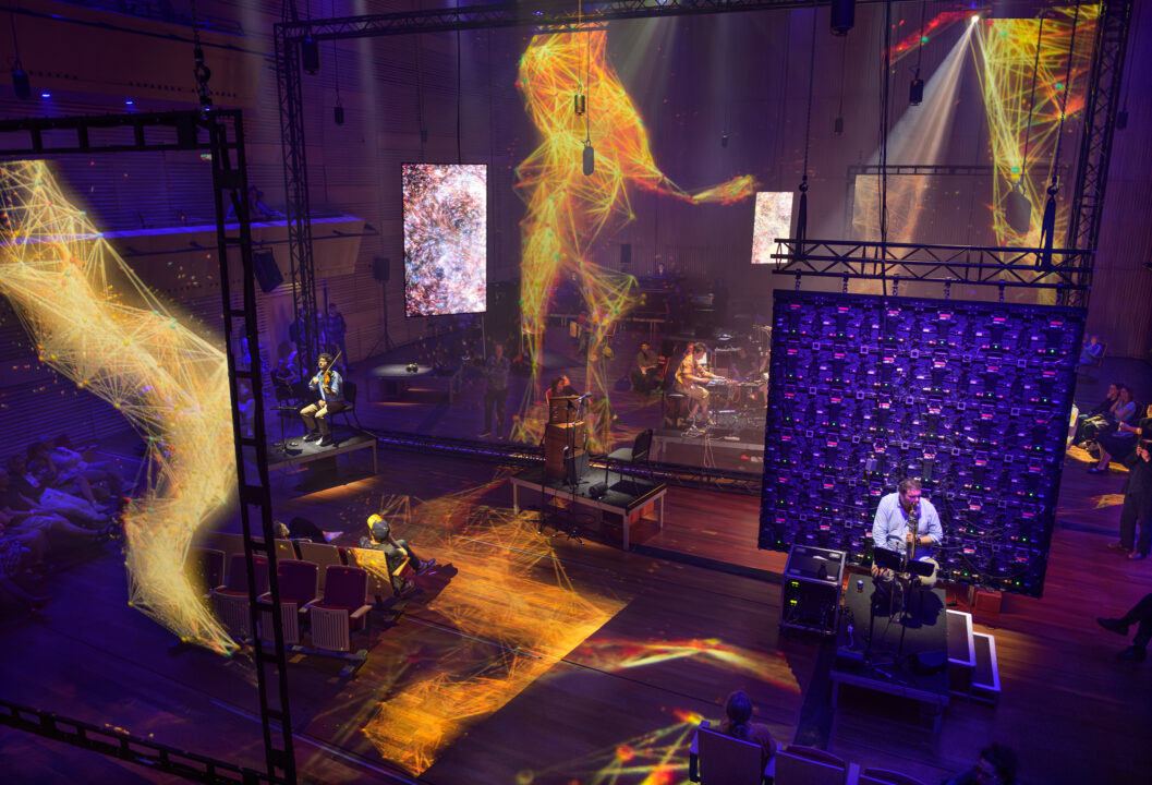 De muziek wordt live gespeeld, maar wordt tegelijkertijd getransformeerd door een reeks algoritmes die de vooraf opgenomen beelden en geluiden van de solisten voortdurend muteren. Solisten, visuele projecties en elektronica ontmoeten elkaar in een hallucinerende ruimte, ontworpen door Theun Mosk.